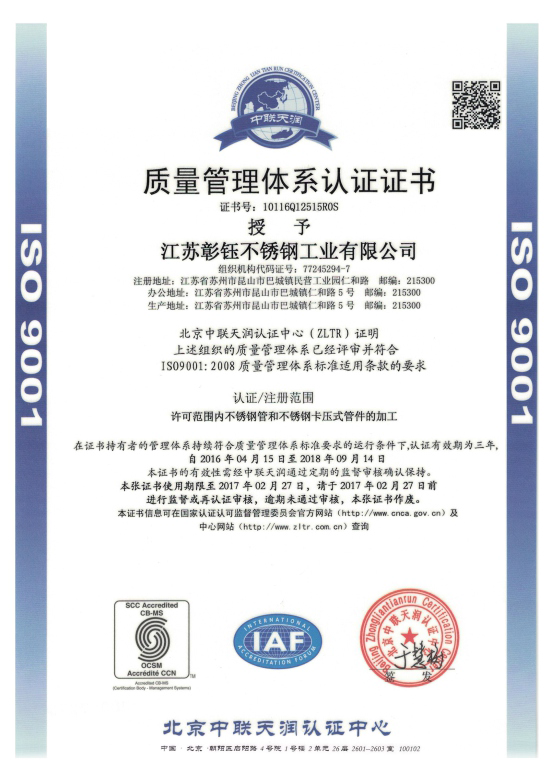 江蘇彰鈺不銹鋼工業有限公司是生產不銹鋼焊管、管件及其制品的專業企業,公司坐落于江蘇省昆山市生態景觀的陽澄湖旁,交通便捷。 公司擁有國內先進、配套齊全的高精密不銹鋼焊管生產線及卡壓式管件生產設備,并擁有萬能力學試驗、渦流探傷、水壓試驗、金相分析等先進完善的檢測設備,可提供不銹鋼焊管、內整平管及不銹鋼卡壓式、溝槽式、焊接式管件,各項性能均符合GB、JlS、ASTM等國家及國際規格標準,并廣泛用于汽車、自行車、醫療器械、自來水、流體輸送等行業。